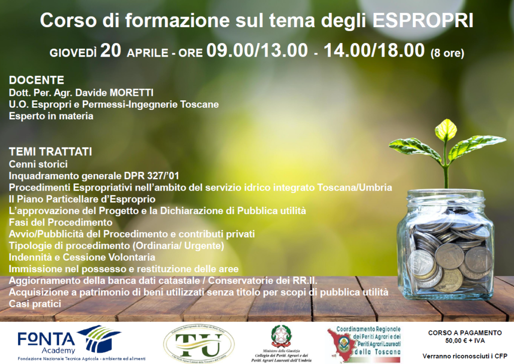 Giovedì 20 aprile dalle ore 09.00 alle ore 18.00 si terrà online su piattaforma GoToWebinar un corso di formazione sugli espropri, organizzato dalla Federazione interregionale dei Collegi dei Periti Agrari e Periti Agrari Laureati della Toscana e dell’Umbria, con la partecipazione di Fo.N.T.A. Academy.